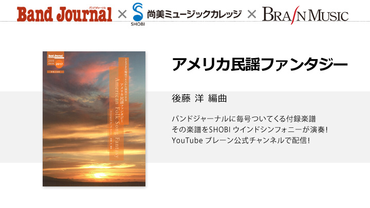 昨年2月号の付録で大変好評だった《アメリカ民謡ファンタジー》の第2弾。今回も後藤洋先生編曲のフレキシブル編成でお届けします。子どものころに歌ったことがあったり、映画で使われていたりと、実は聴きなれた曲も多いアメリカ民謡。今回はどんな曲が入っているのでしょうか?「この曲もアメリカ民謡だったの!?」という発見があるかもしれませんよ! お楽しみに!