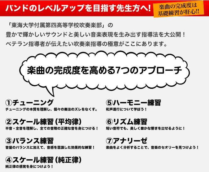 「チューニングで音が合わない…」、「基礎に取り組んでも効果が上がらない…」 「合奏しても曲を吹けるようになるまで時間がかかる…」など、 指導者が持たれている悩みを解決する秘訣がここにあります。