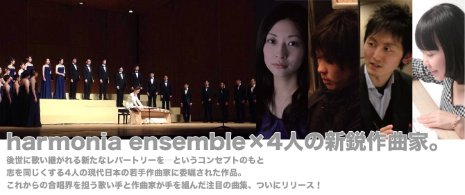 harmonia ensemble は、World Youth Choir(世界青少年合唱団)に参加した経験のあるメンバーや、音楽大学に在籍する合唱経験の豊かな学生を中心にして2009 年4 月に結成された混声室内合唱団。 メンバー一人一人が自発的に音楽を作り、他のメンバーと意見を交わしあいながら、一つの音楽にまとめていくという独特のスタイルで活動している。