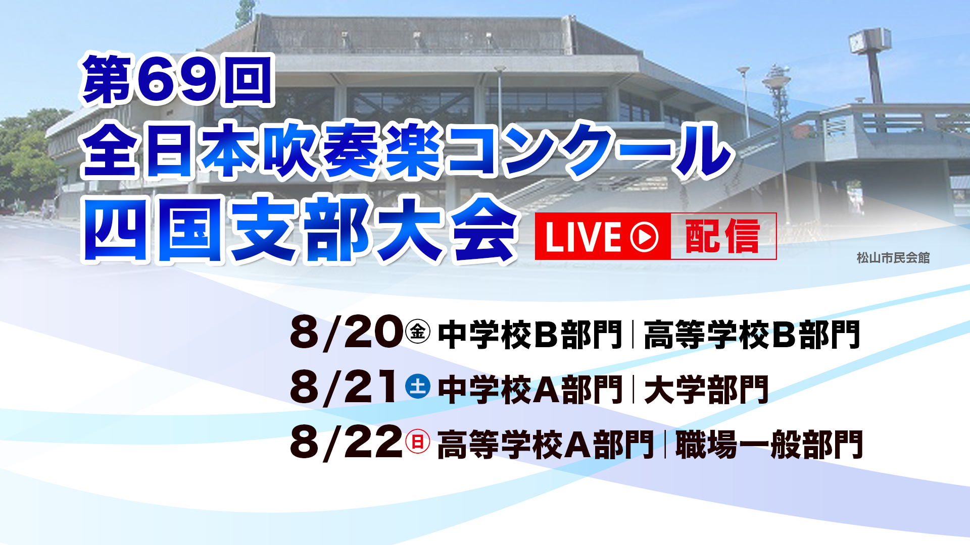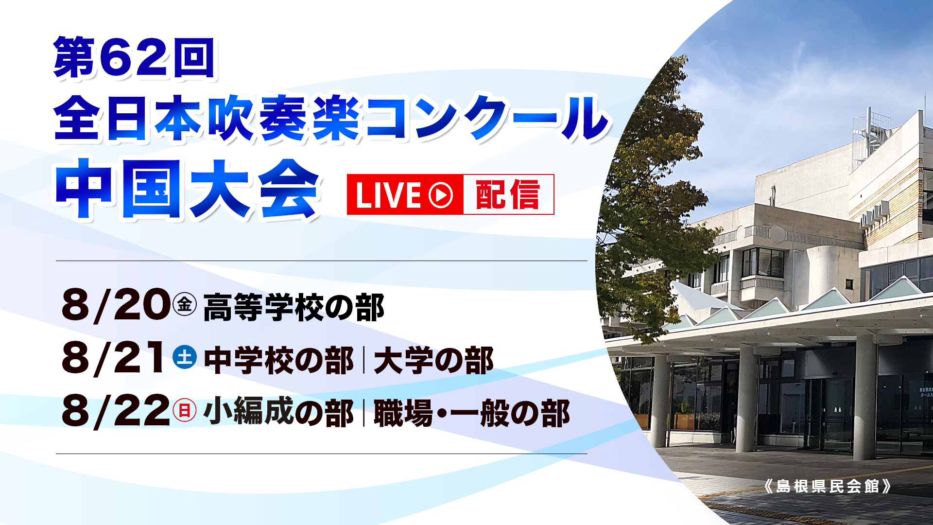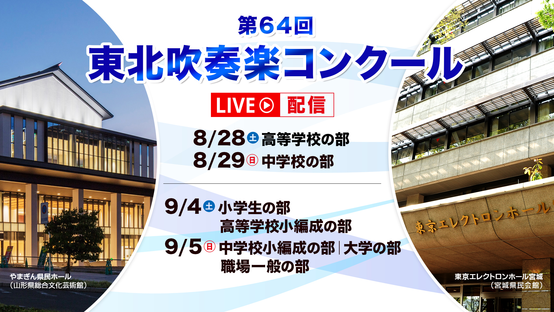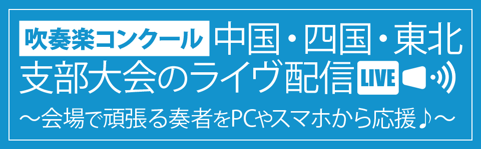 吹奏楽コンクールの 中国・四国・東北の3支部 において、映像・音声収録とライブ動画配信を担当させていただきます。 支部ごとに有観客・無観客ではありますが、ライヴ配信が実施されますので詳細は下記でご確認ください。